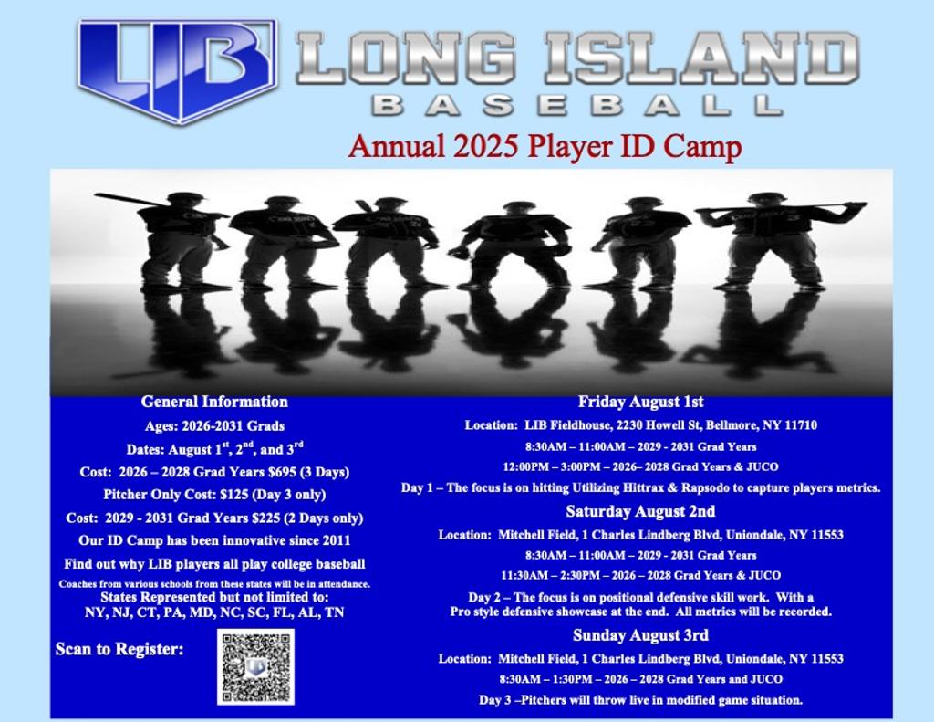 Location: Mitchell Field, 1 Charles Lindberg Blvd, Uniondale, NY 11553 8:30AM – 1:30PM – 2026 – 2028 Grad Years and JUCO